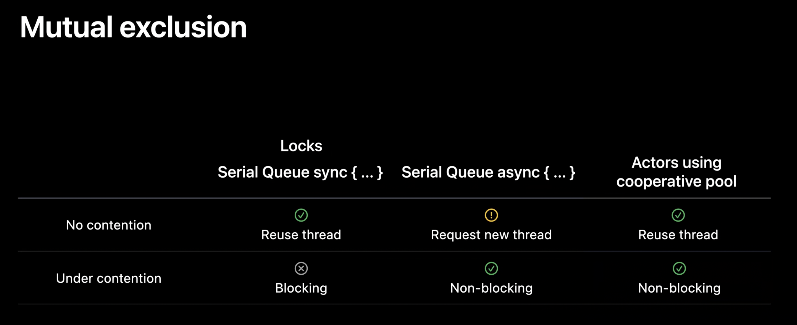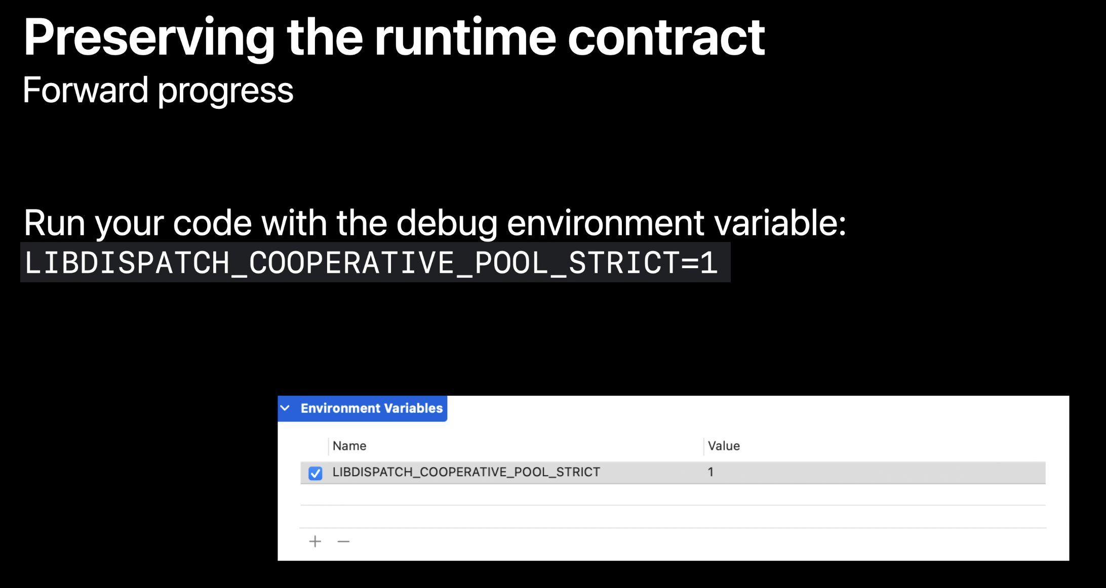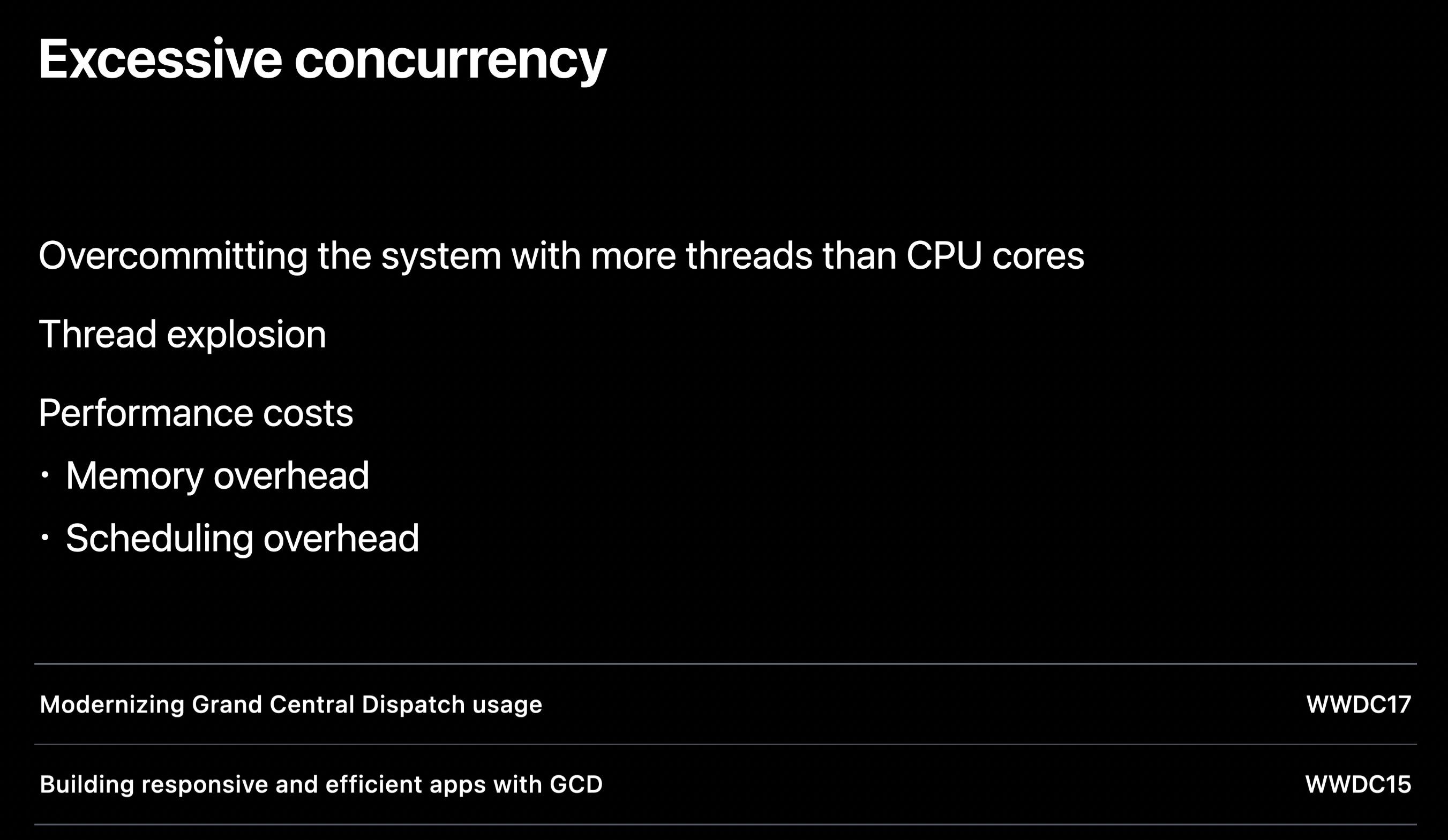 - Swift Concurrency를 채택할 때 협력 스레드 풀이 최적으로 작동할 수 있도록 코드에서 이 계약을 계속 유지하는지 확인하는 것이 중요함