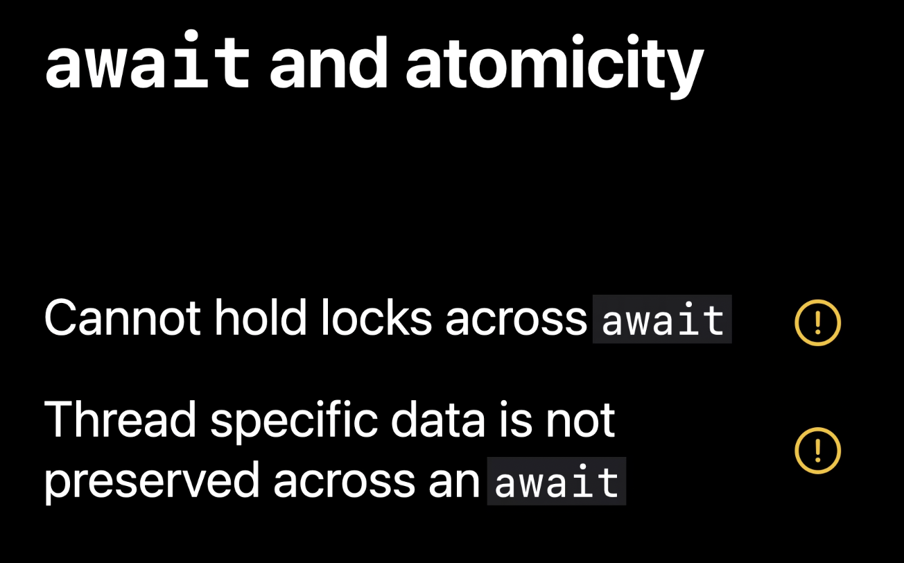 - 스레드지역성을 예상하는 코드의 모든 가정은 await의 일시 중단 동작을 설명하기 위해 다시 검토해야 함
