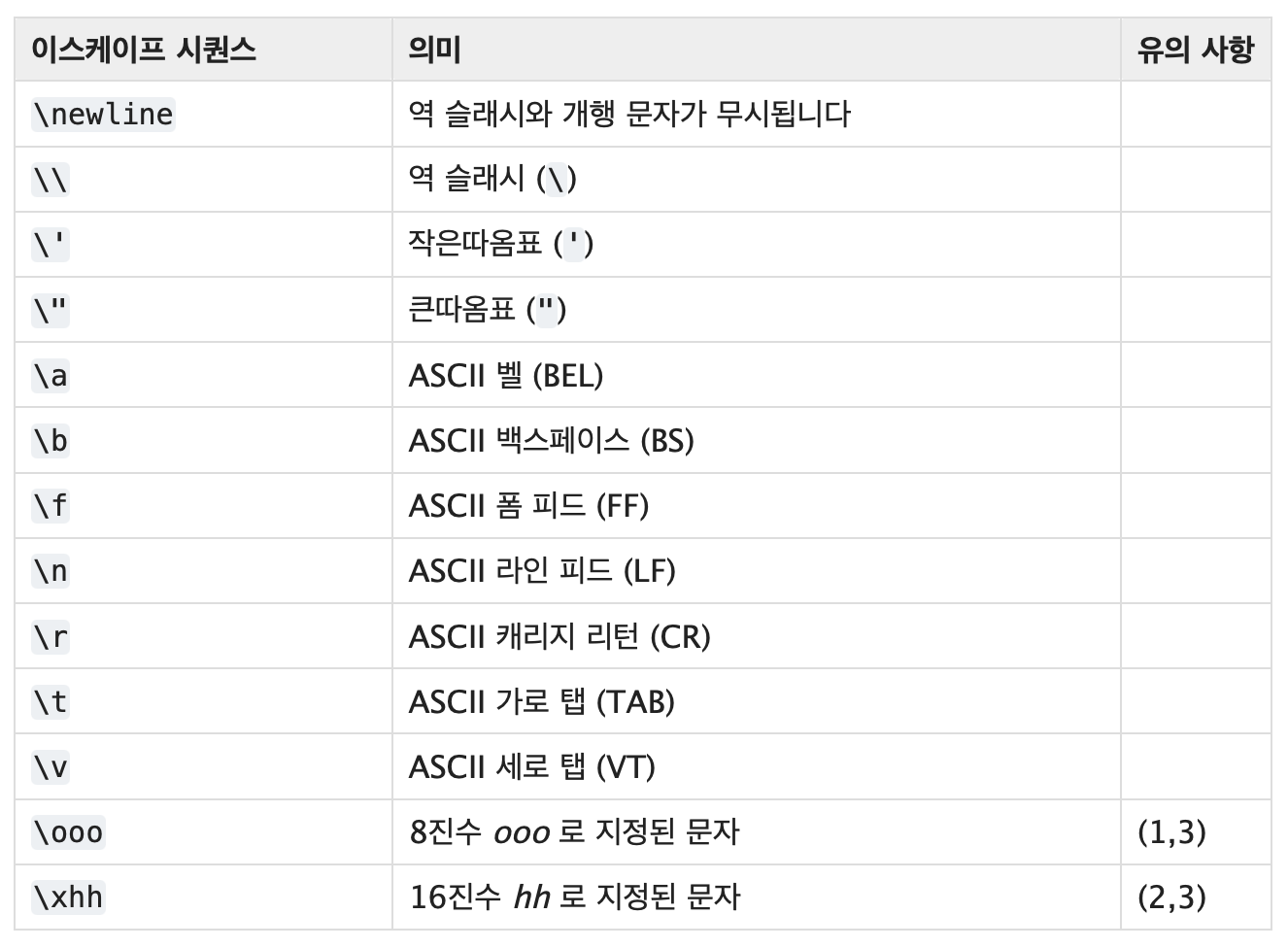 1) 이스케이프 시퀀스 : 문자열 안에서 같이 출력되는 문자가 아닌, 별도의 기능을 제공하는 문자,